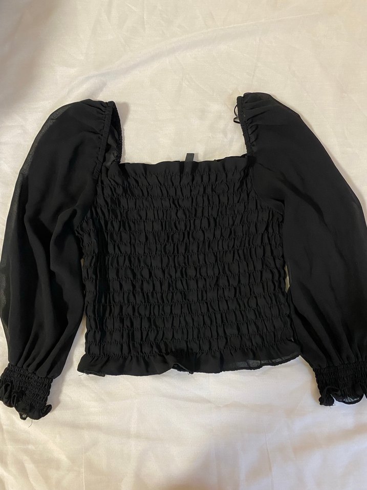 Şık siyah gipeli bluz. Kare yaka ve transparan uzun kol detayıyla zarif bir görünüm sağlar. Gövde kısmı esnek gipeli yapıya sahiptir ve vücuda uyumlu, rahat bir kullanım sunar. Normal boydadır, hem günlük hem özel kombinlerde tercih edilebilir. Desensiz, şık ve zamansız bir parçadır.