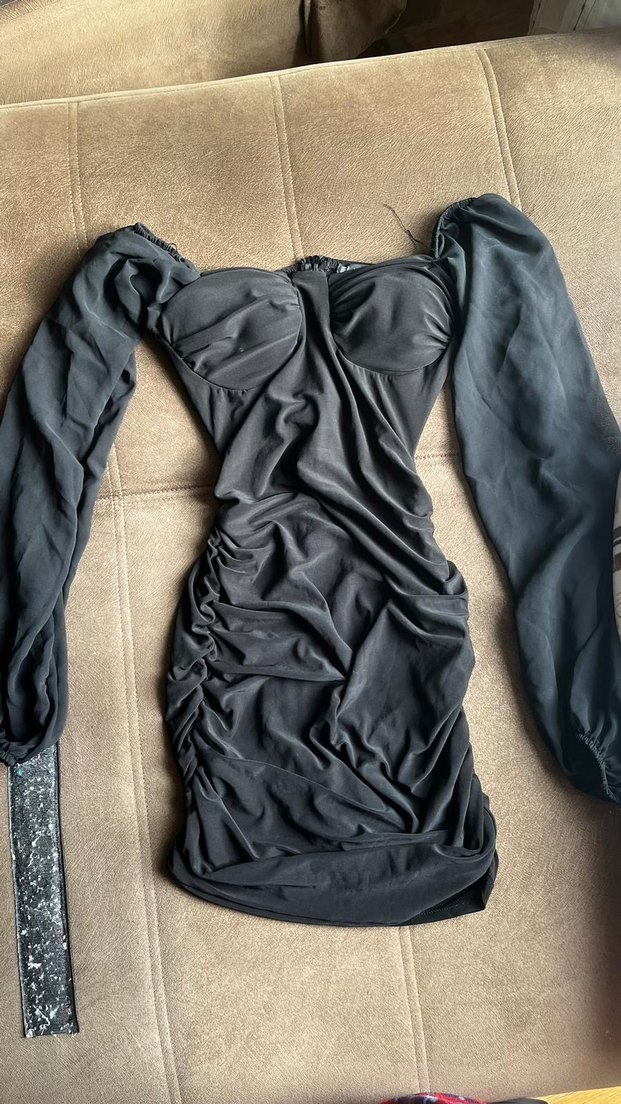 Siyah, v yaka ve uzun kollu bu drapeli midi elbise, gotik tarzı yansıtarak romantik akşamlar için ideal bir seçimdir.