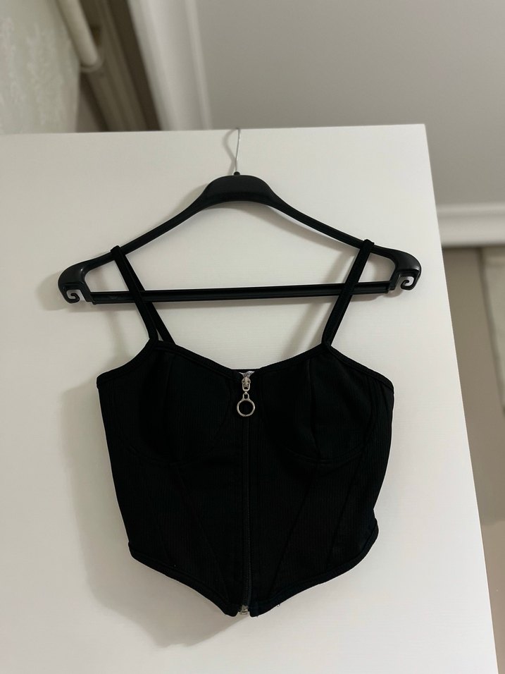 V yaka ve ince askılı, önden fermuar halkalı siyah bustiyer. Gotik ve tokalı detaylı, sentetik kumaştan yapılmış.
