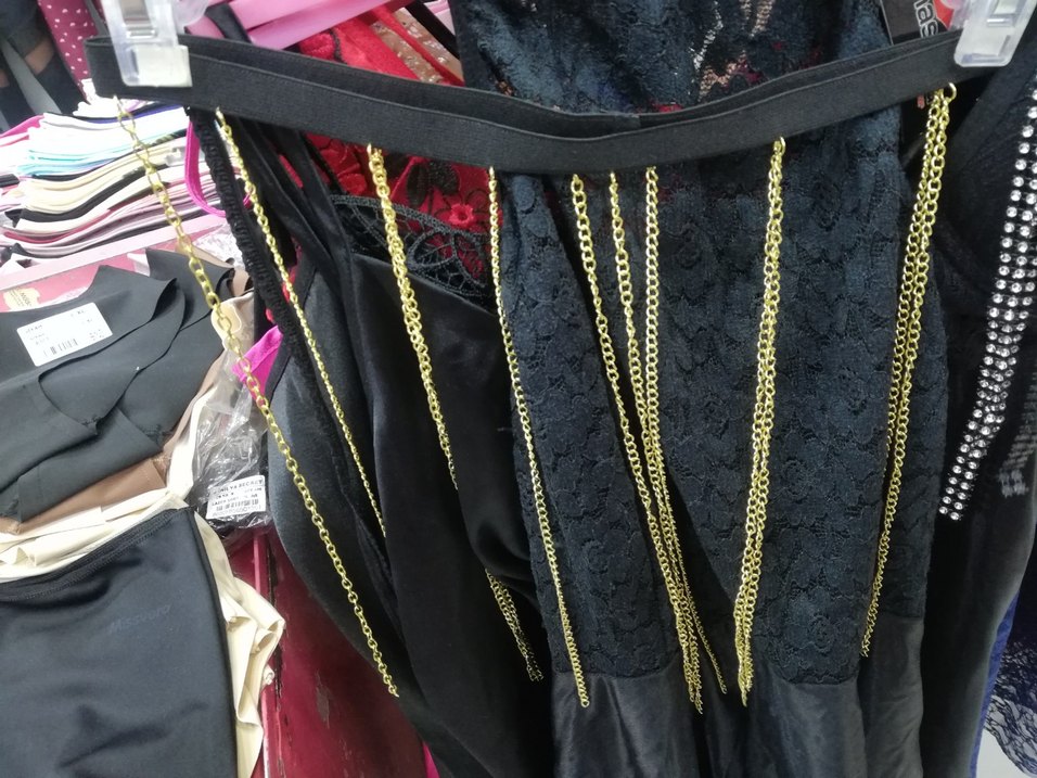 Siyah gotik tarzda, işlemeli ve altın renk zincir detaylı kadın vücut zinciri. Cesur parti kombinleri için uygundur.
