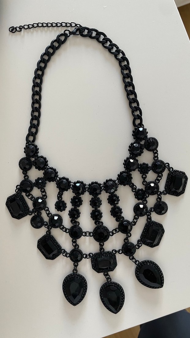 Siyah gotik zincir detaylı, desenli taşlı midi uzunlukta kolye. Cesur ve romantik gece kombinleri için uygundur.