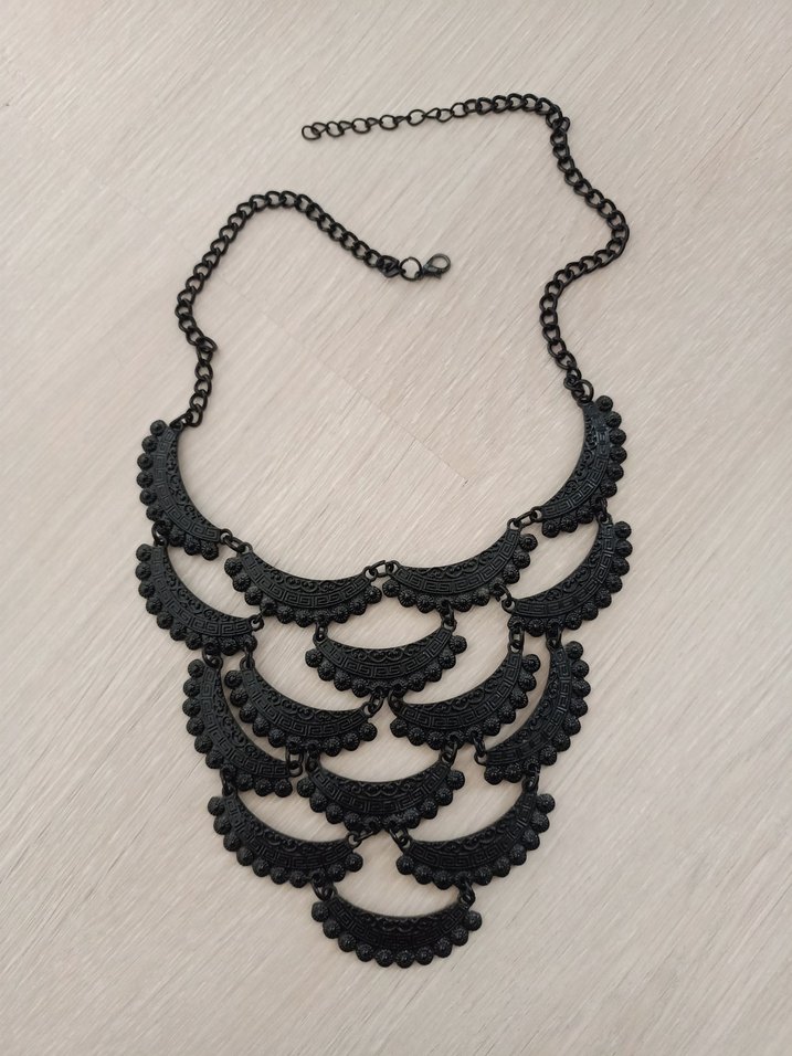 Siyah gotik stil uzun kolye, zincir detayları ve desenli tasarımıyla günlük kullanıma uygundur.