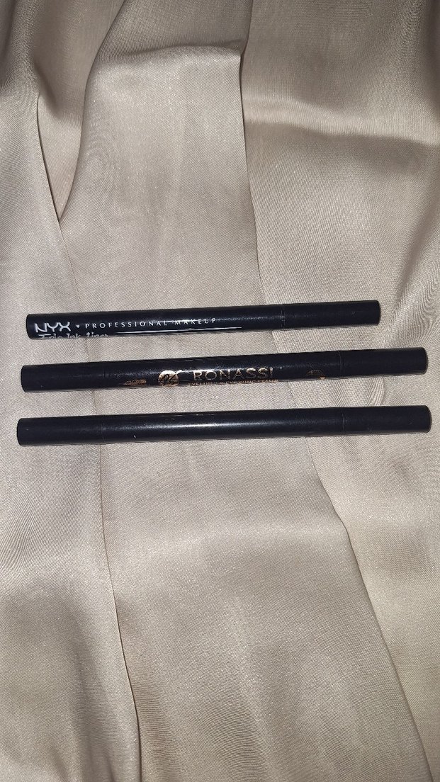NYX ve Bonkassi markalarından üç siyah göz kalemi ve eyeliner seti, göz makyajında hassas uygulama sağlar. Bir tarafı şekilli bir tarafı normaldir!