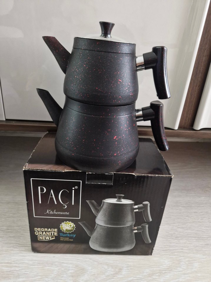 Siyah granit çaydanlık takımı, ergonomik sapları ve şık tasarımı ile çay demlemeyi kolaylaştırır. ☕ hediye gelmişti sadece yıkadım bir kere su kaynattım kullanırım diye kaldırmıştım ama fazla olduğu için kullanmadım. çok şık bir çaydanlık