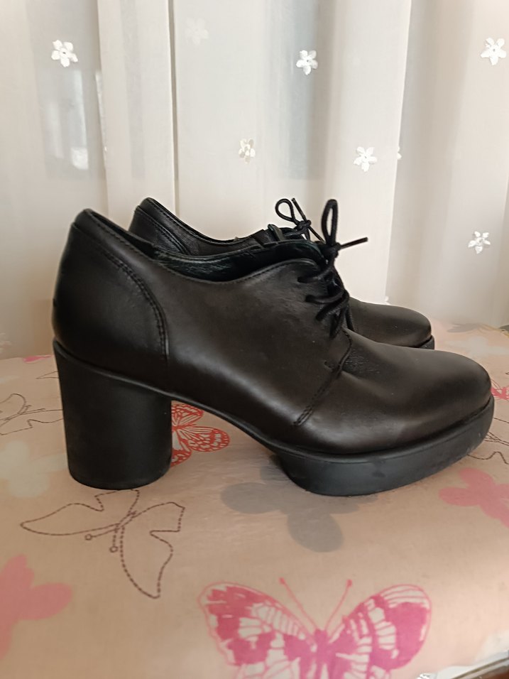 Siyah klasik kadın ayakkabısı, kalın topuklu ve lastik tabanlı, ofis için şık ve rahat bir seçenek. Ürünü tek bir event için alıp giymiştim . Çok temiz,yeni alınmış gibi. Topuk boyu arkadan 7 cm ama önde dolgu oldugu icin kullanımı çok rahat. % deridir.