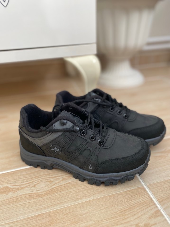 Siyah ve gri renklerde, bağcıklı ve kauçuk tabanlı erkek outdoor ayakkabısı, trend spor ve günlük kullanım için uygundur. Hiç kullanılmadı