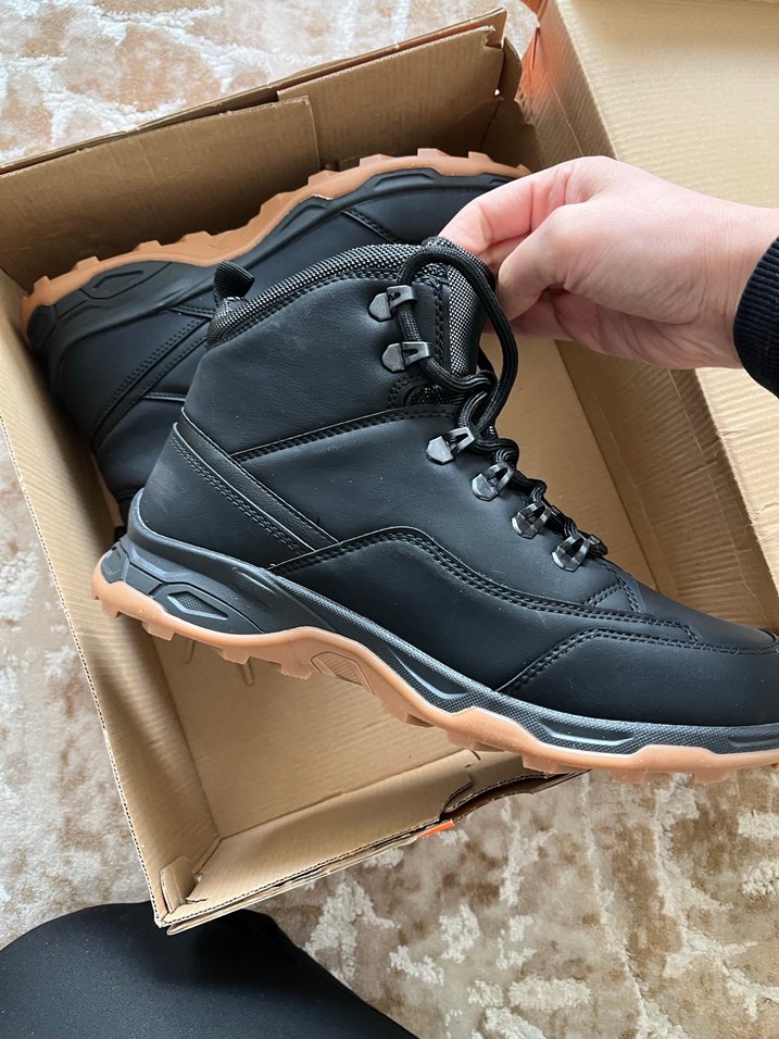 Siyah ve gri renkli, kauçuk tabanlı ve bağcıklı erkek outdoor botu, sokak tarzına uygundur.