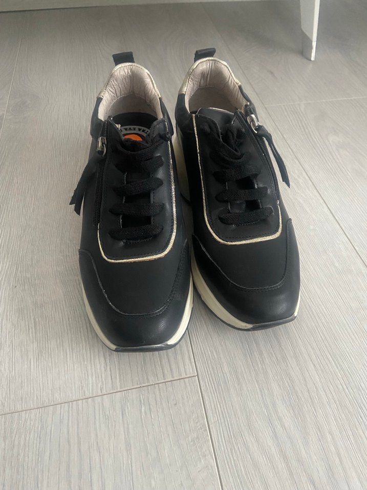 Siyah ve gri renklerde, bağcıklı ve dolgu topuklu kadın spor ayakkabısı. Kauçuk tabanlı, günlük sokak stili için uygundur. Deri