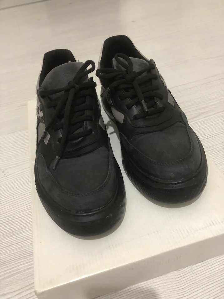 Siyah ve gri renkte, bağcıklı ve düz tabanlı kadın spor ayakkabısı, rock punk tarzına uygun.