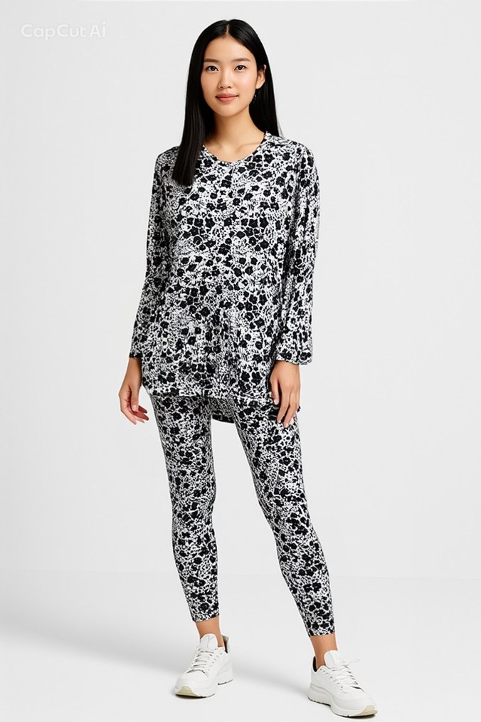 Siyah ve gri bağlamalı desenli, uzun kollu, yuvarlak yakalı, bol kesim hamile pijama takımı. Midi uzunluğunda üst ve uyumlu tayt içerir.