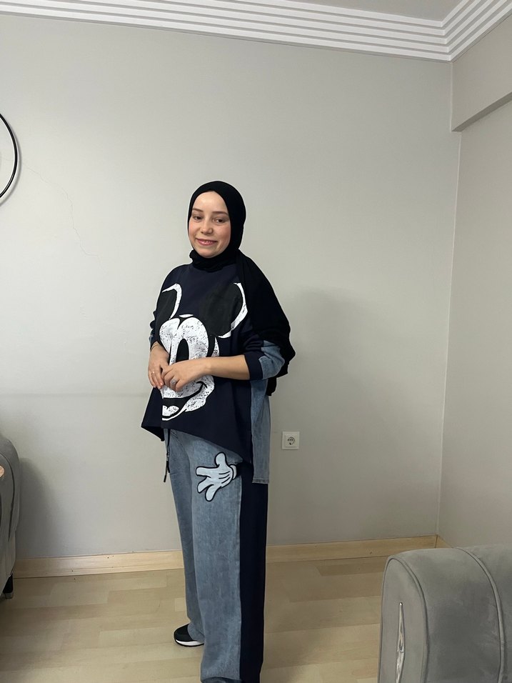 Kadınlar için siyah ve gri renkli, baskılı desenli, bol kesim, uzun kollu, bisiklet yaka, drapeli denim eşofman takımı. Midi boy, günlük kullanıma uygun rahat ve mütevazı tarzda. Açıklar için de uygundur L/XL beden