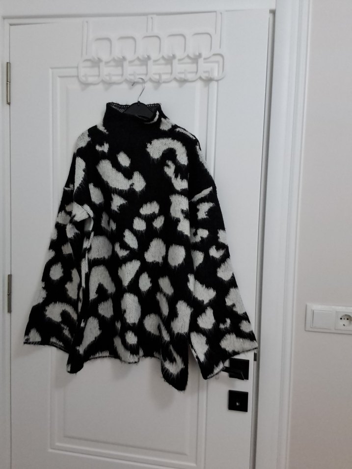 Siyah gri batik desenli, uzun kollu, boğazlı kadın kazak. Yumuşak kürk detayları ve rahat kesimiyle günlük kullanıma uygundur. Standart kalıp uzunluğu 71 cm kollu uzunluğu 52 cm