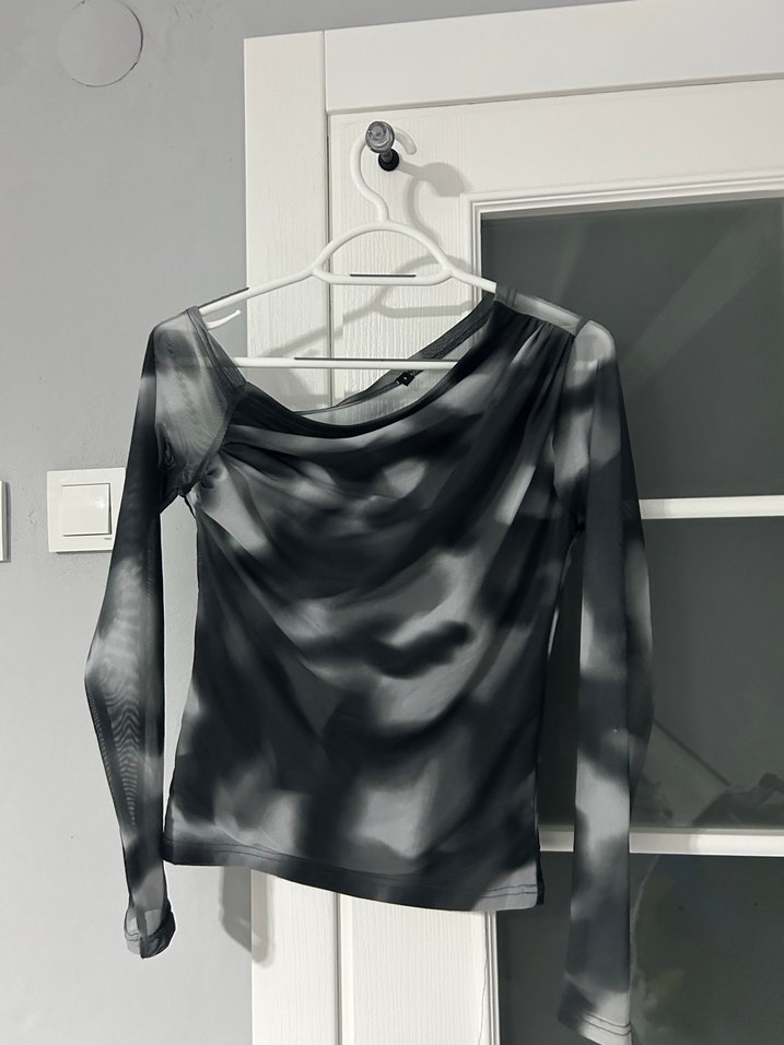 Drapeli tekne yaka ve uzun kollu, siyah gri batik desenli, ince ve ipeksi kumaştan yapılmış, modern ve minimalist tarzda kadın bluzu.