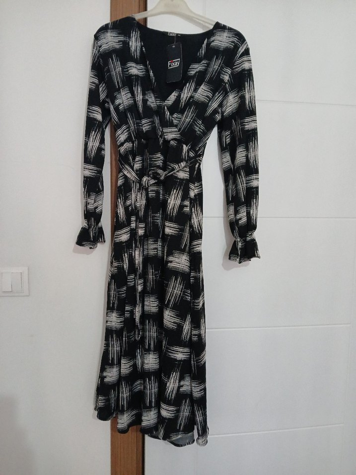 Siyah ve gri tonlarda, batik desenli, pileli detaylı, uzun kollu ve V yakalı, bol kesim uzun kadın elbisesi. Sentetik kumaştan, sokak modasına uygun.