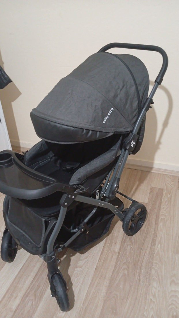 Siyah ve gri renklerde olan bu bebek arabası, geniş tente ve ön tepsiye sahiptir. Dayanıklı iskelet ve konforlu oturma alanı sunar. çif taraflı kullanılır