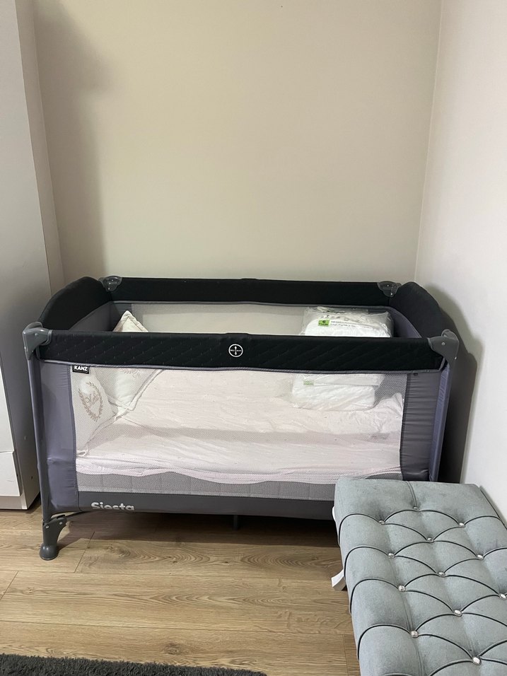 Siyah ve gri renklerde bebek oyun parkı, havalandırma ve görünürlük için file yanlara sahiptir. İçinde yumuşak bir yatak ile rahat bir dinlenme alanı sunar. ️Bursa elden teslim