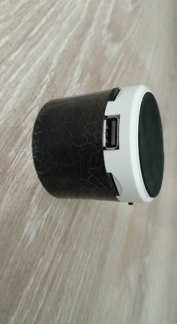 Bu Bluetooth hoparlör, siyah ve gri renklerde, USB bağlantı noktası bulunan kompakt silindirik tasarıma sahiptir.
