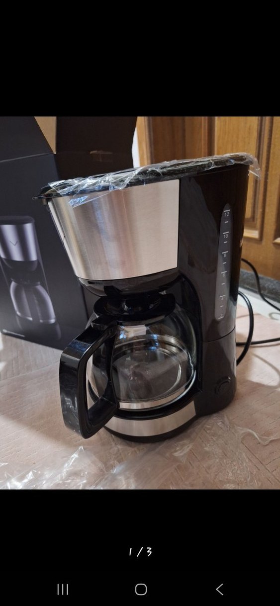 Siyah ve gri renklerde, cam hazneli ve yan tarafında su seviyesi göstergesi olan kahve makinesi. ☕ vestel marka sıfır kutusunda hic kullanılmadı