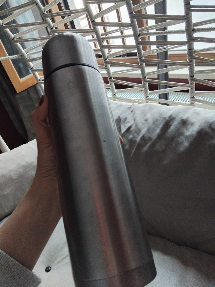 Siyah ve gri renkli çelik termos şişe, içecekleri saatlerce sıcak veya soğuk tutar. Güvenli vidalı kapak ile taşıması kolaydır.
