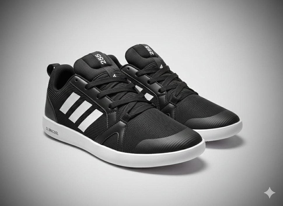Siyah ve gri renklerde, çizgili desenli, bağcıklı ve kauçuk tabanlı erkek spor ayakkabısı. 41 numaraları mevcuttur
