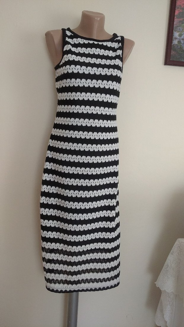 Uzun, kolsuz triko elbise siyah ve gri çizgili, dantel detaylıdır. Vücuda oturan kesimi ve kayık yaka tasarımı minimal ve çağdaş tarzı yansıtır. Günlük kullanıma uygundur.