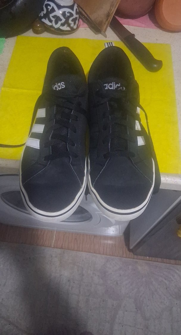 Çizgili tasarıma sahip siyah ve gri erkek spor ayakkabısı, cırt cırtlı kapanışlıdır. Kauçuk tabanlı, sportif ve günlük sokak stili için uygundur.