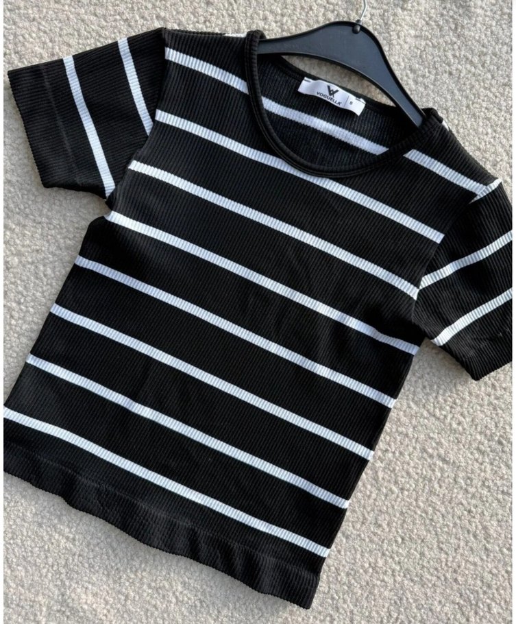 Kısa kollu, kayık yaka ve siyah gri çizgili örme sentetik kumaştan yapılmış, vücuda oturan kısa boy kadın tişörtü. Günlük ve sokak stiline uygun.