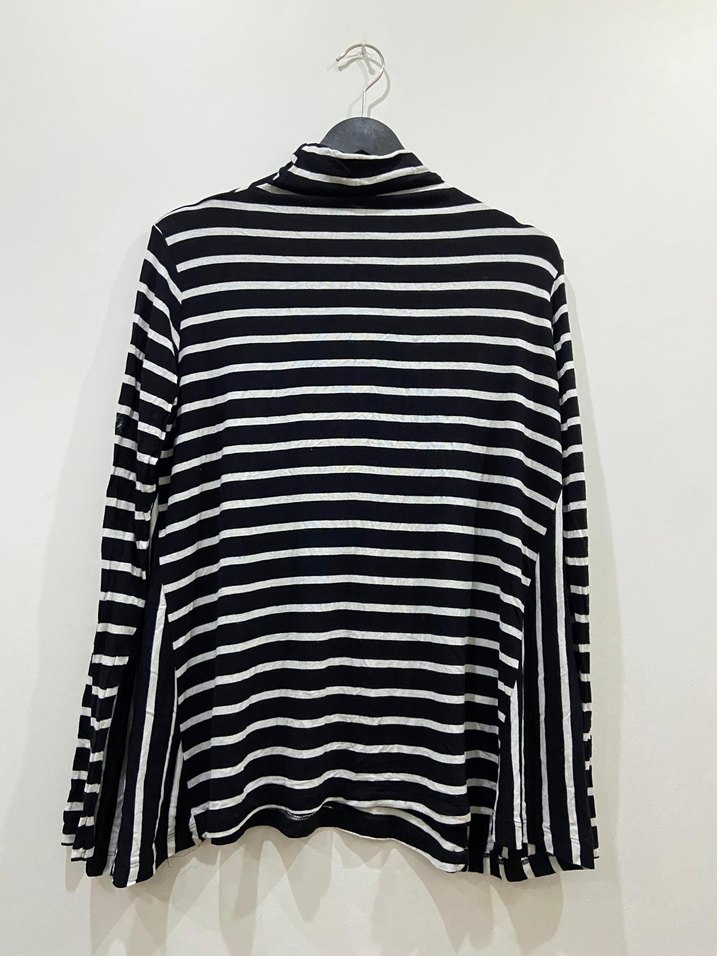 Bu kadın trikosu, balıkçı yaka ve pliseli uzun kollara sahiptir. Siyah ve gri çizgili, bol kesim ve keten kumaştan üretilmiştir. Rahat günlük kullanım için uygundur.