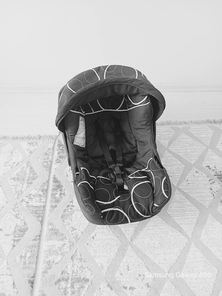 Siyah ve gri renklerde, dairesel desenlere sahip bebek oto koltuğu, ayarlanabilir emniyet kemerleri ile güvenli seyahat sağlar.