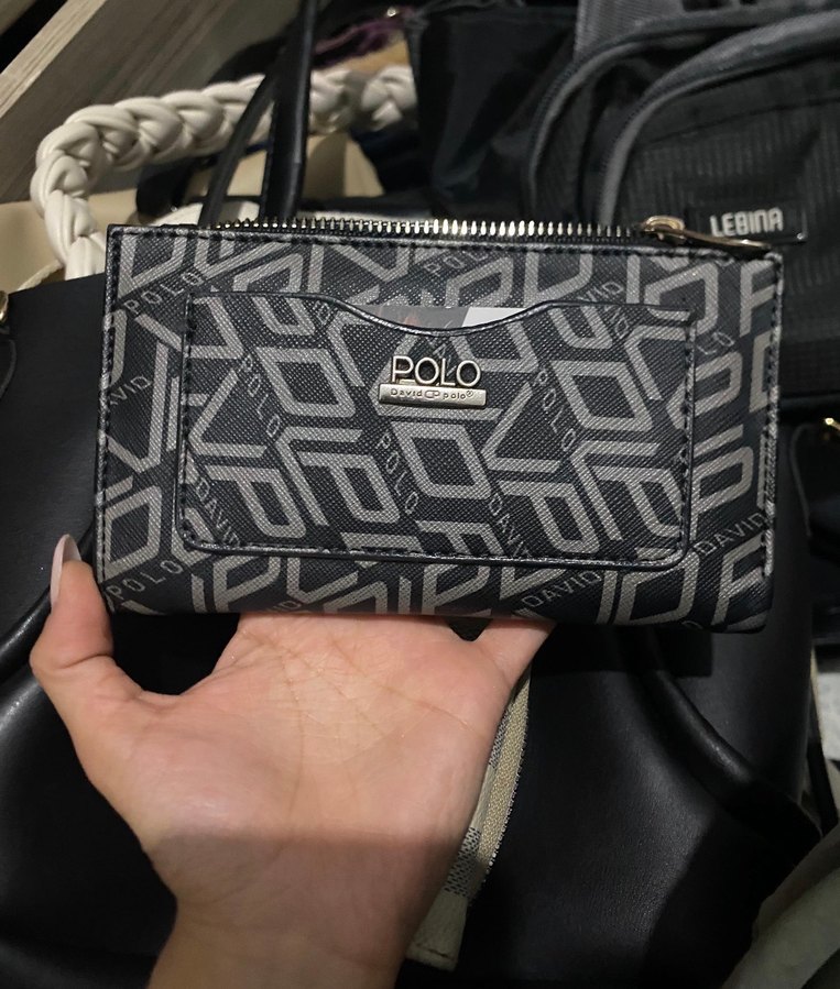 Fermuarlı kapanışa sahip, gri siyah baskılı sentetik kumaştan yapılmış kadın cüzdanı, genç ve sokak stili için uygun. hiç kullanılmadı