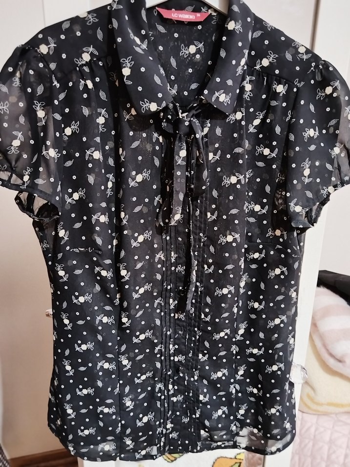 Siyah, gri desenli, kısa kollu, yakalı ve düğmeli kadın bluz. Rahat kesimi ve sentetik kumaşı ile günlük şık görünüm sağlar.