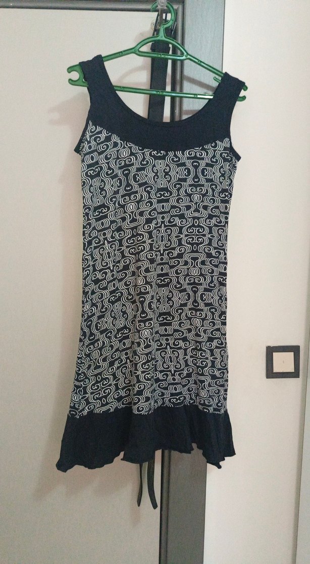 Siyah ve gri tonlarda, desenli ve volanlı etek ucu detaylı, kayık yaka, kolsuz ve vücuda oturan uzun elbise. Günlük kullanıma uygun minimalist gotik tarzda.