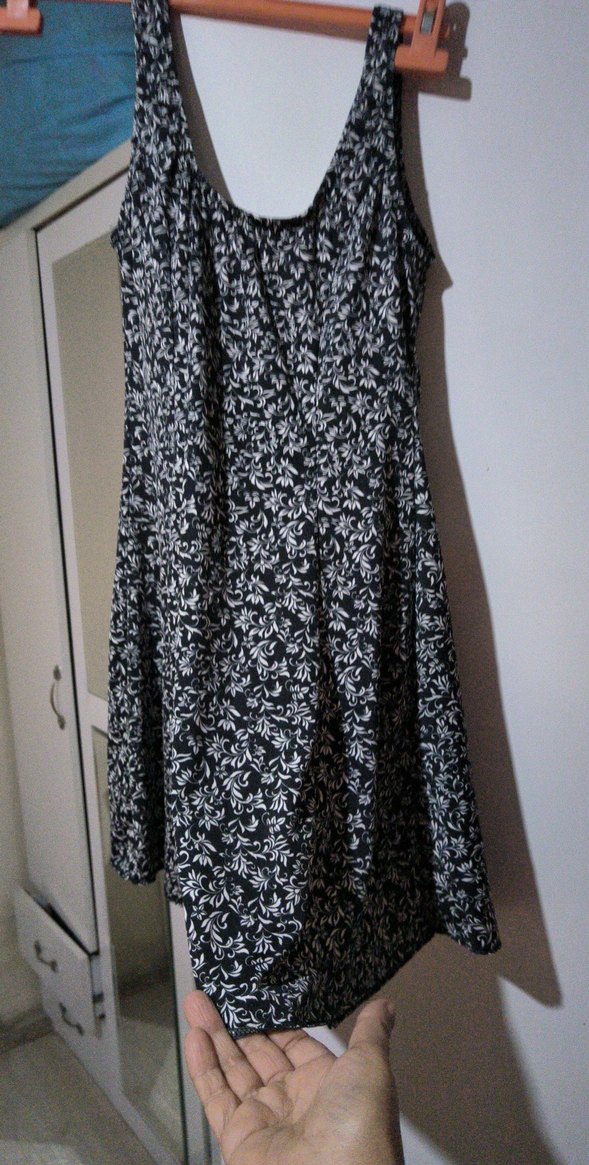 Siyah ve gri renkte, straplez yakalı, pileli detaylı, bol kesim midi elbise. Sentetik kumaştan üretilmiş, günlük kullanım için uygundur.