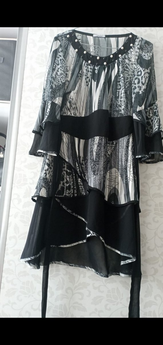 Siyah ve gri desenli tunik, volan detaylı ve bol kesimdir. yaka ve askılı kollara sahiptir, yumuşak sentetik kumaştan üretilmiştir. Günlük kullanıma uygundur, gotik tarzda.ince iç gösterir astarsız