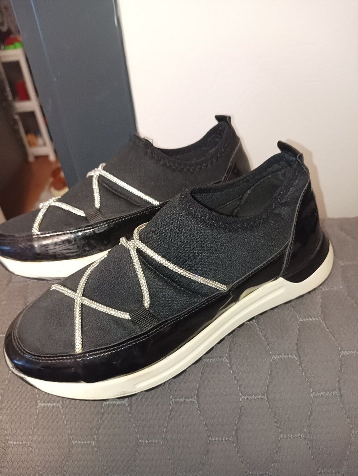 Siyah ve gri renklerde, dolgu topuklu ve elastik üst yapıya sahip sokak stili sneakers. Günlük kullanım için kauçuk tabanlı, rahat bir model.