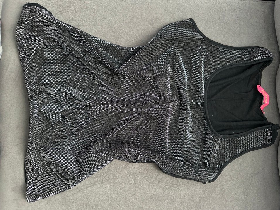 Siyah ve gri sentetik kumaştan, drapeli tasarıma sahip, kolsuz ve boğaz kesimli, vücuda oturan midi jumpsuit. Günlük kullanım için uygundur.