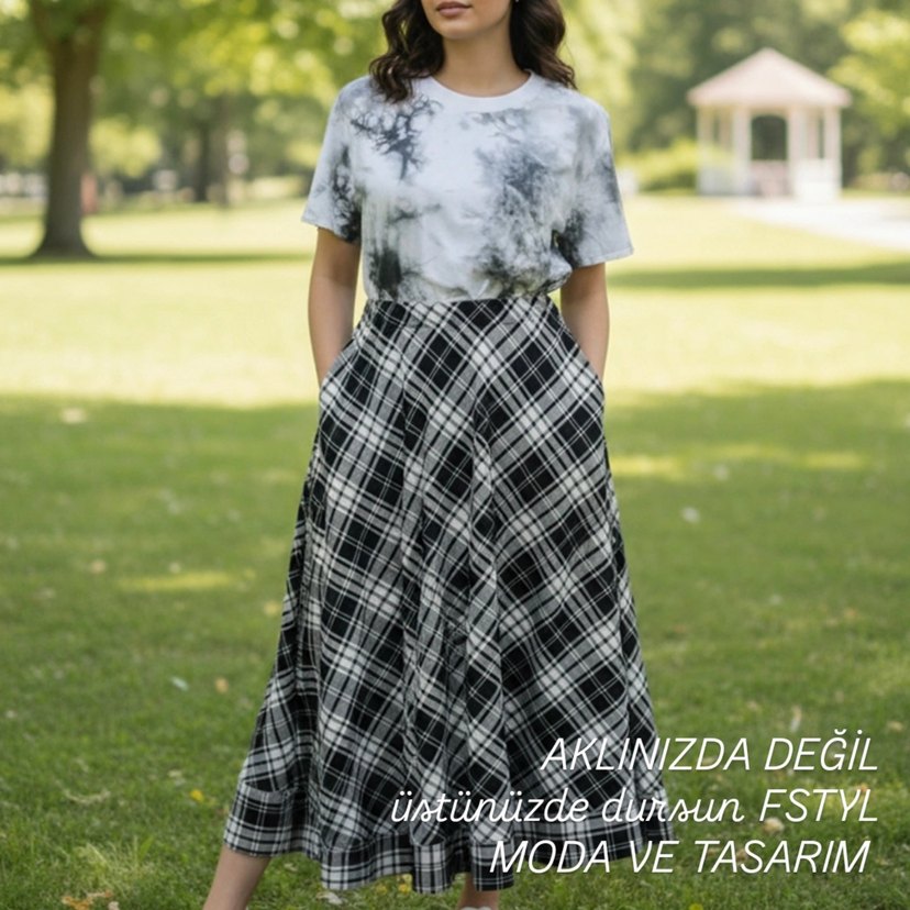 Pamuk kumaştan, siyah ve gri ekoseli, bol kesim mini etek. Günlük sokak stili için rahat ve şık bir tercih.