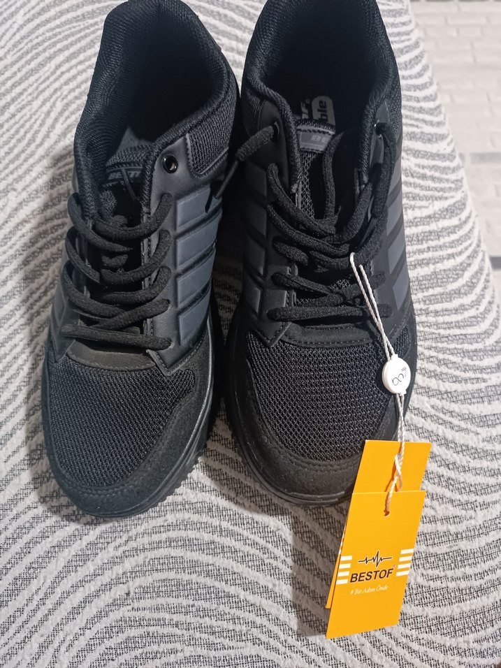 Siyah ve gri renklerde, baskılı detaylı erkek spor ayakkabısı. Velcro kapama ve kauçuk tabanlıdır. BESTO markasıdır.