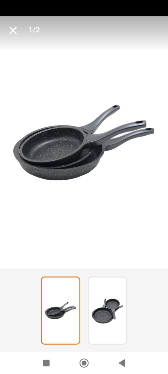 Bu set, gri granit görünümlü yüzeye ve ergonomik saplara sahip iki siyah tava içerir, çok yönlü pişirme için uygundur.