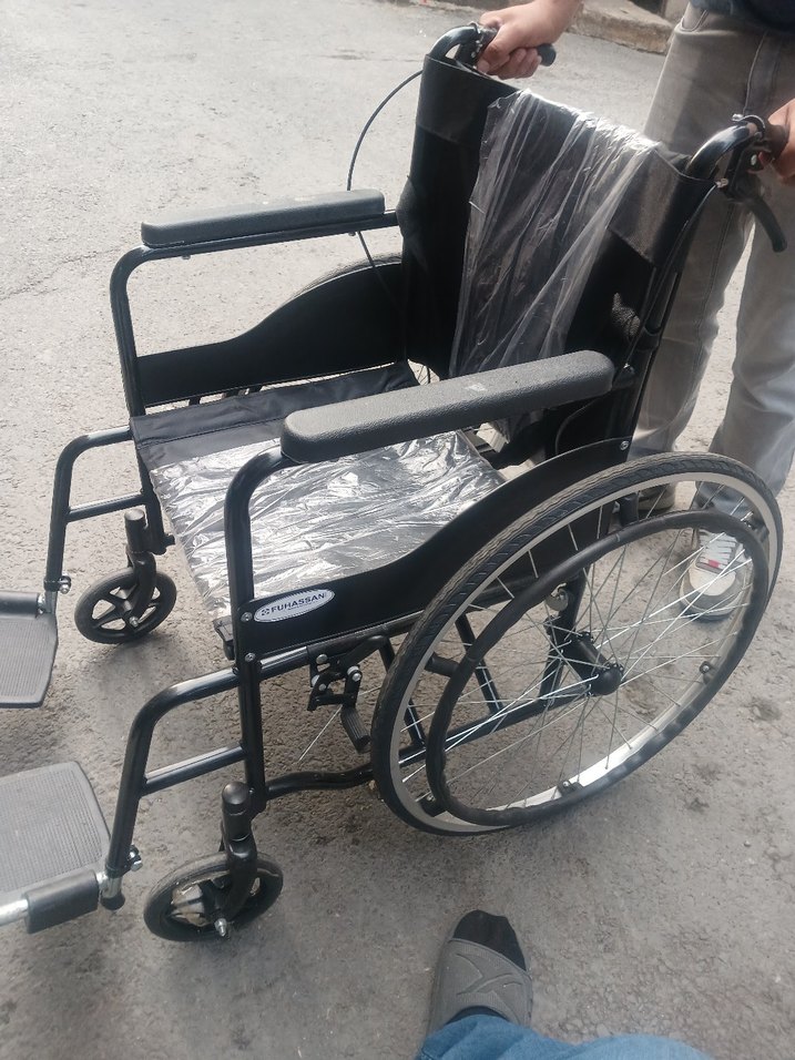 Siyah ve gri renkte, sağlam yapıya sahip hasta arabası. Rahat kol dayama yerleri, büyük arka tekerlekler ve ayak destekleri bulunur. frenli ve emniyet kemerli acinip kapanabilir 100 120 kg kapasitesini kaldırır