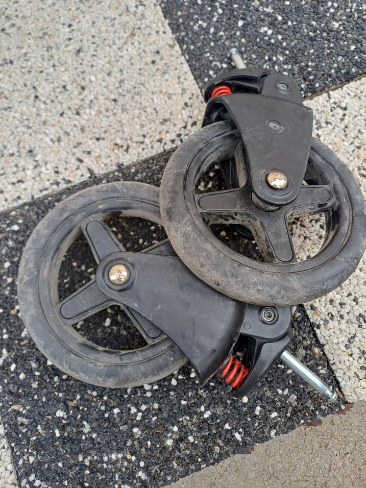 Siyah ve gri renklerde, dayanıklı yapıya sahip ve süspansiyon yaylı bebek arabası ön teker takımı bırtanesı üst kısımda kırık var biri sağlam, kırık olanda tekeri sağlam