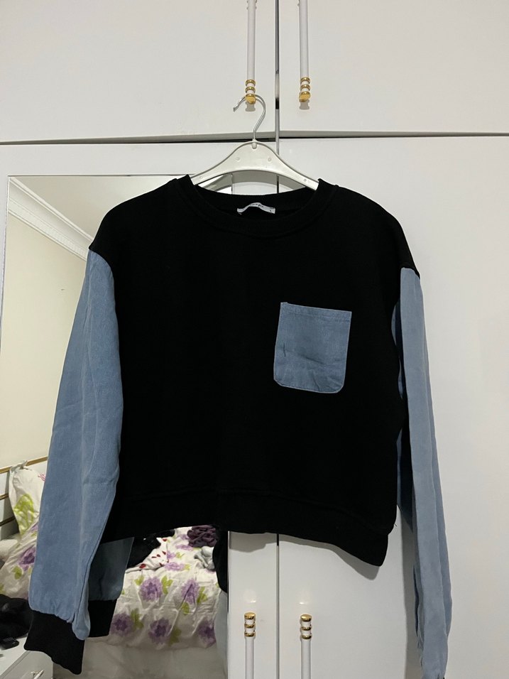 Kadınlar için uzun kollu, gri denim detaylı ve bol kesim siyah sweatshirt. Ön cep ve cırt cırtlı detaylarla günlük sokak tarzına uygun.