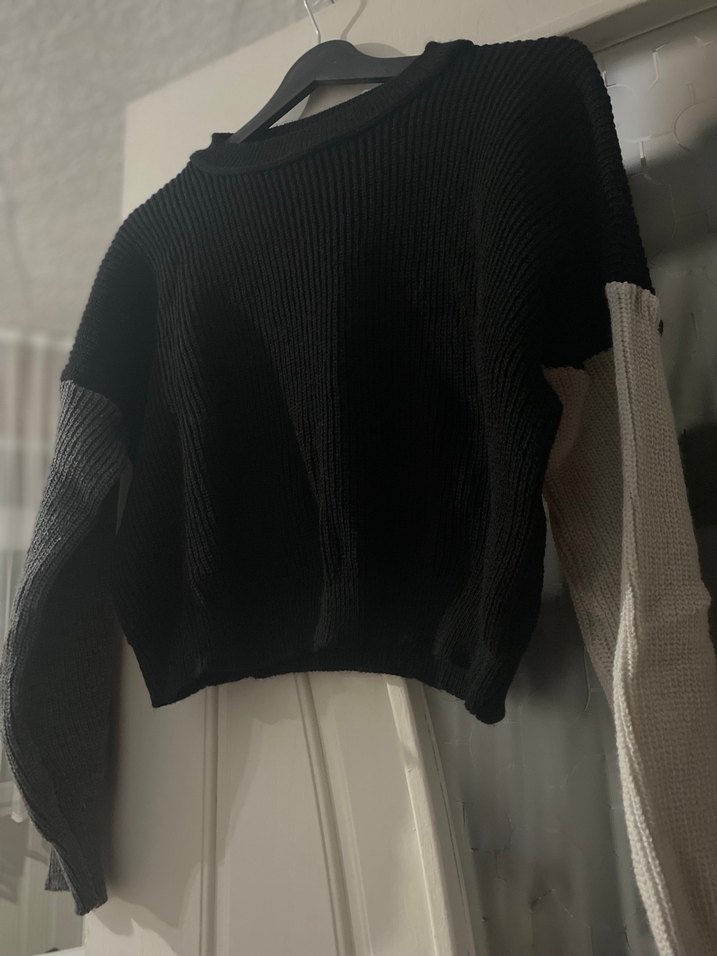 Kadınlar için örgü dokulu, uzun kollu ve yuvarlak yakalı kazak. Siyah gövde ve gri kollarla rahat ve salaş kesim, günlük kullanım için uygundur.