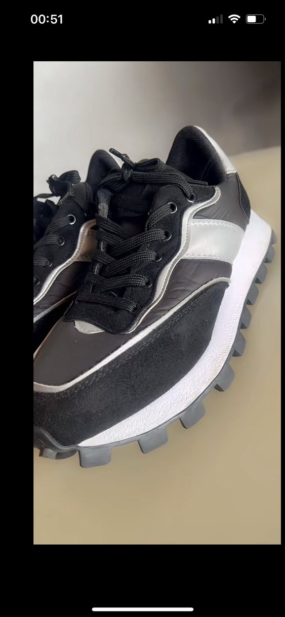 Siyah ve gri renklerde, lastik tabanlı kadın spor ayakkabısı. Desensiz tasarımıyla rahat ve şık bir görünüm sunar.