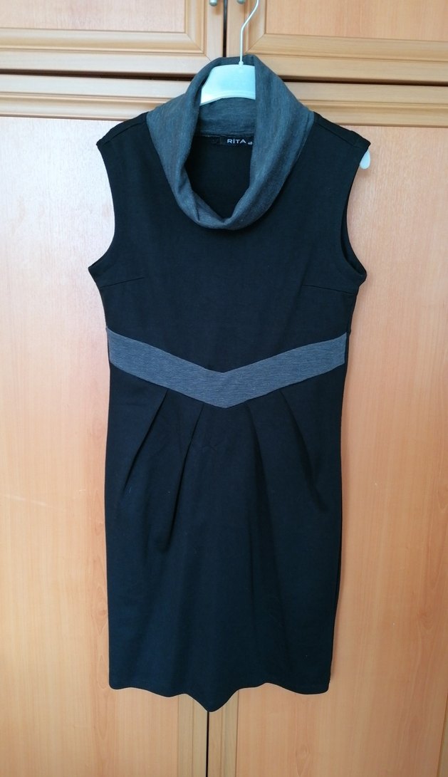 Kolsuz, yüksek yakalı ve kemerli siyah-gri hamile elbisesi. Yumuşak sentetik kumaştan, günlük kullanıma uygun şık ve modern bir model.