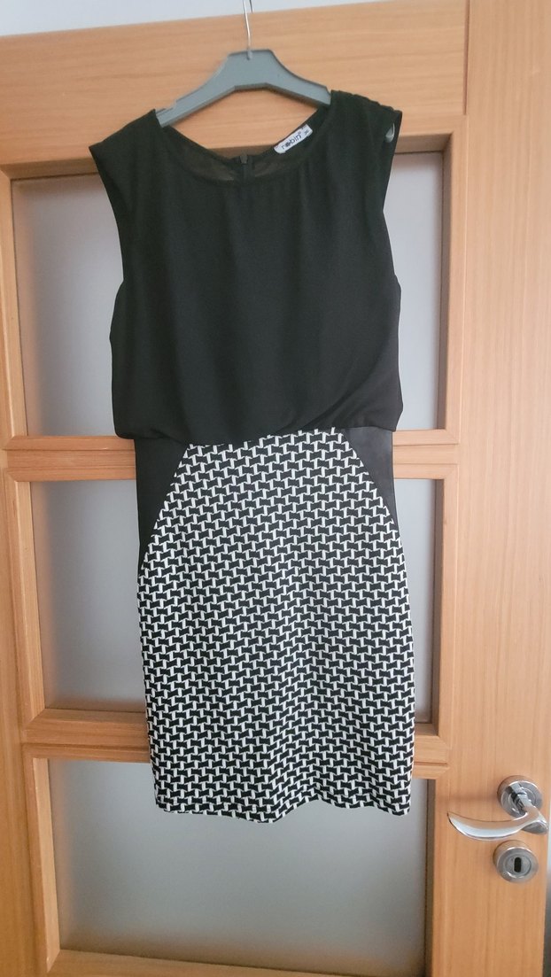 Siyah ve gri desenli, kemerli, vücuda oturan Yumuşak sentetik kumaştan üretilmiş, ofis için çağdaş tarzda elbise.