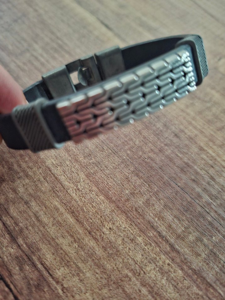 Siyah bant ve gri metal plaka detaylı, minimalist rock punk tarzı erkek bileklik. Cesur ve sade tasarım sunar. ⚡