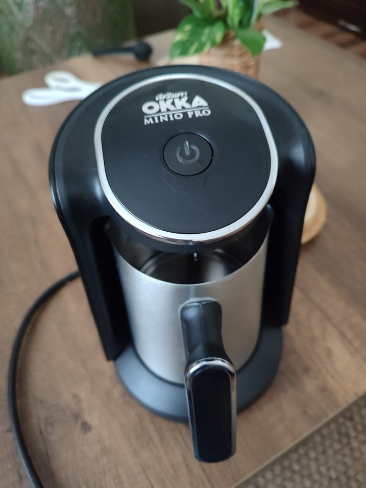 Okka Minio Pro kahve makinesi siyah ve gri renkte, tek düğme ile kolay kullanım sunar. Kompakt yapısı ile Türk kahvesi hazırlamaya uygundur. ☕