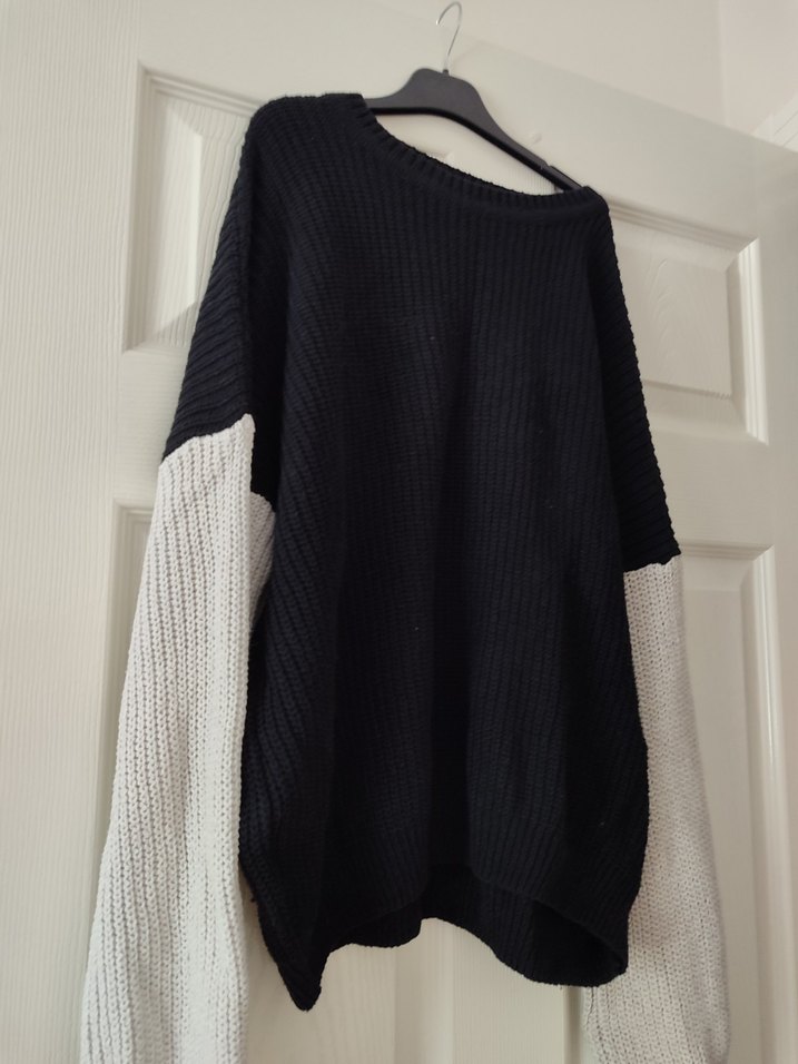 Salaş kesim, uzun kollu, yuvarlak yakalı örgü triko. Siyah gövde ve gri kollara sahip, rahat ve günlük sokak stili için uygun.