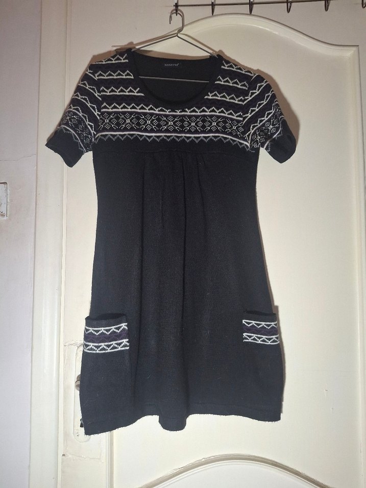 Kısa kollu, bisiklet yaka siyah örme midi elbise, üst kısmında ve ceplerinde gri geometrik desenler bulunur. Rahat ve salaş kesimlidir.